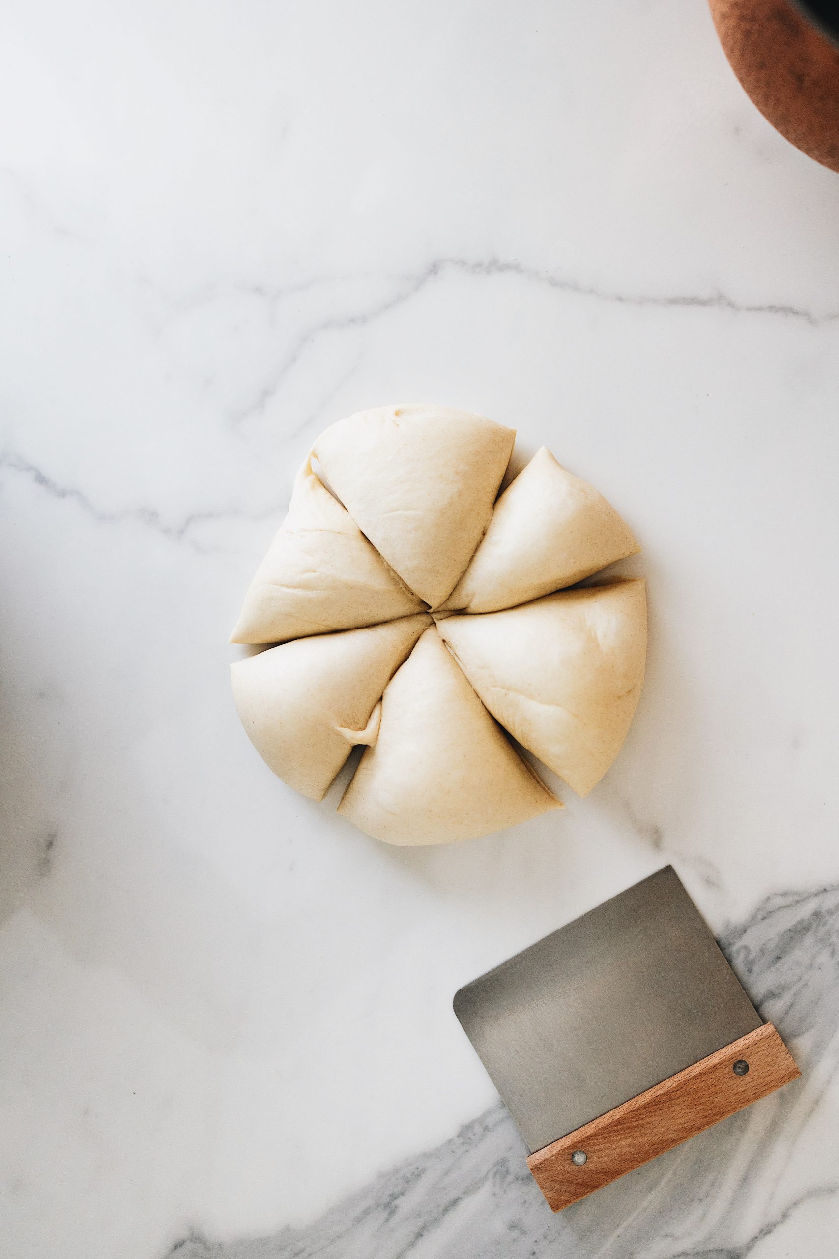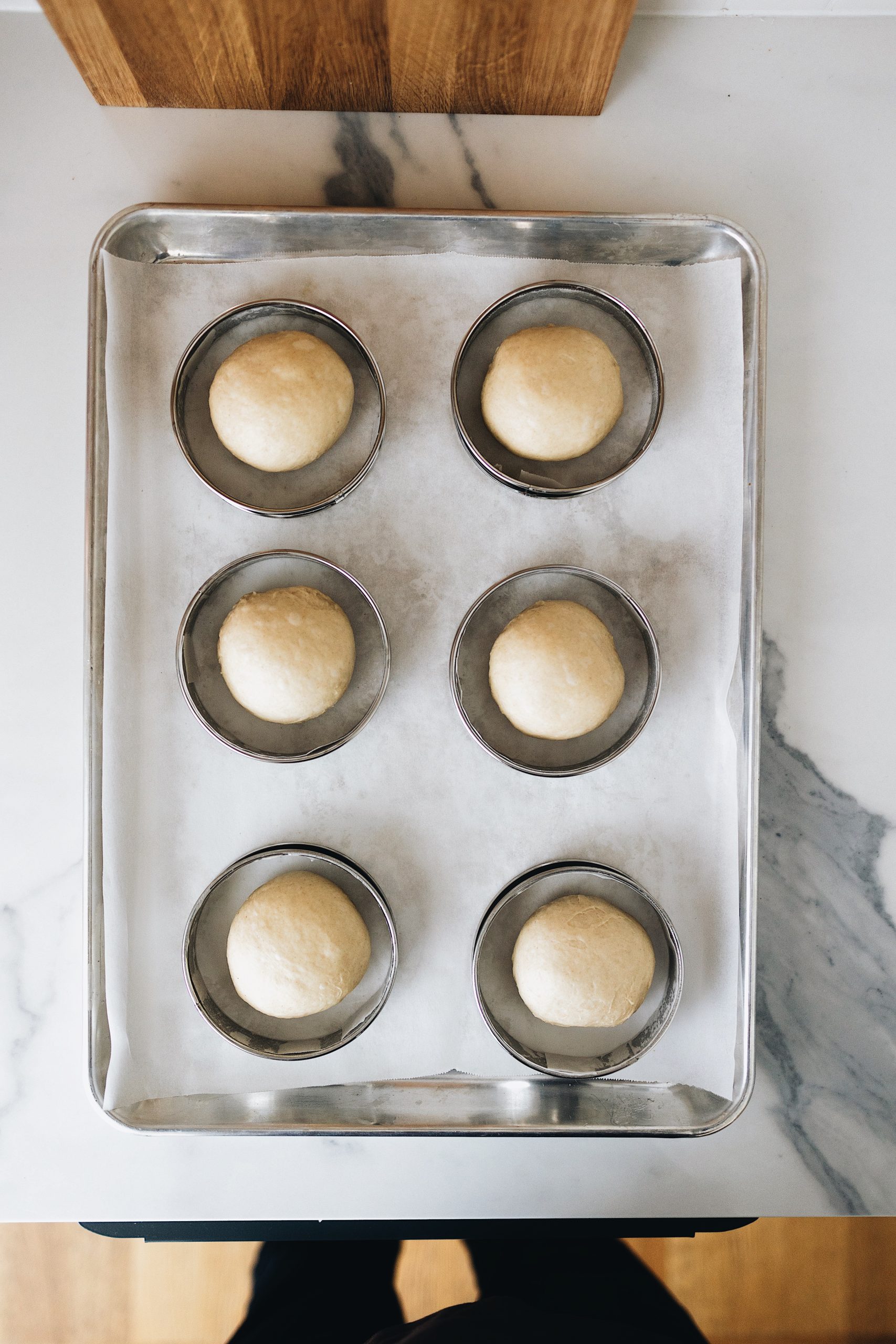 Trascorso il tempo di lievitazione dividete l’impasto in 6 parti uguali e procedete con la pirlatura di ogni pagnottella. Prendete una teglia, ricopritela con carta da forno, posizionate sopra gli anelli ed all’interno di essi le palline formate. Fate lievitare per 1 ora.