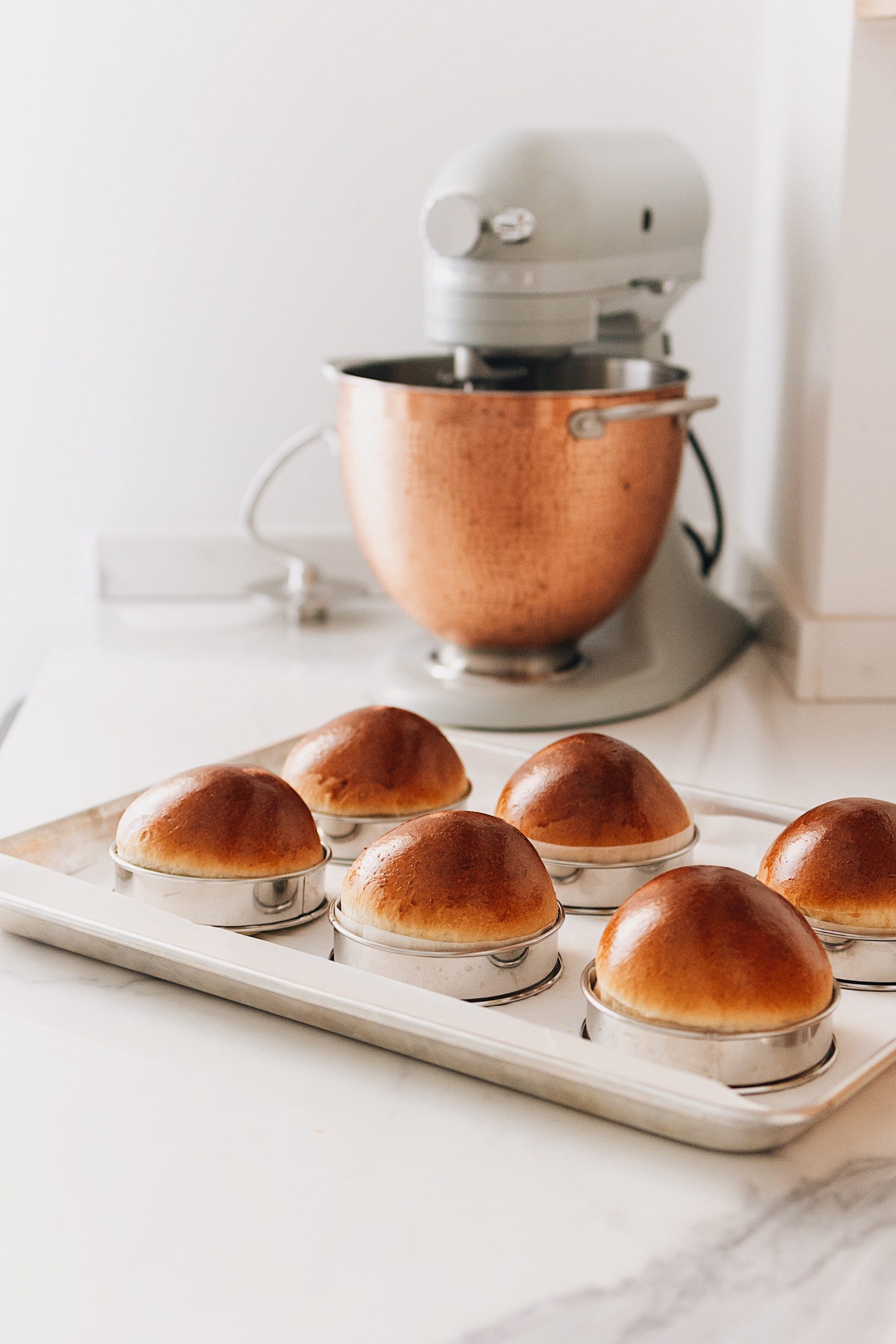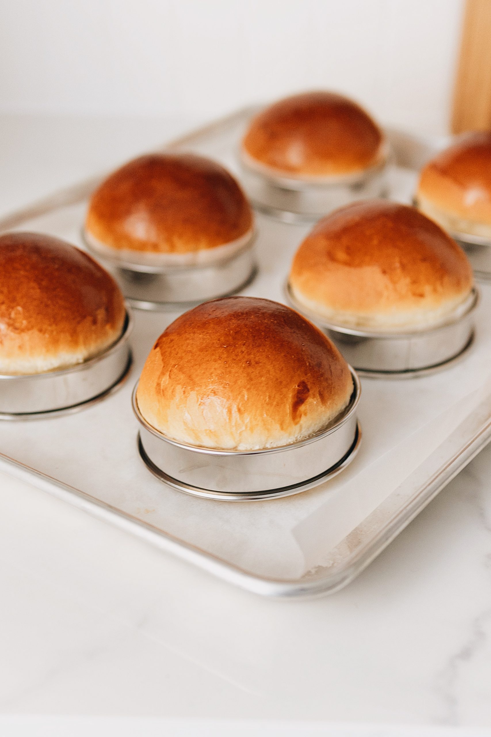 - Per i brioche bun ho usato gli anelli per english muffin. Hanno un diametro di 10 cm e sono questi. L’anello non è indispensabile per la riuscita del bun ma è grazie a lui che hanno questa forma in quanto lievitando all’interno del cerchio crescono regolari in altezza per poi fare la calotta.