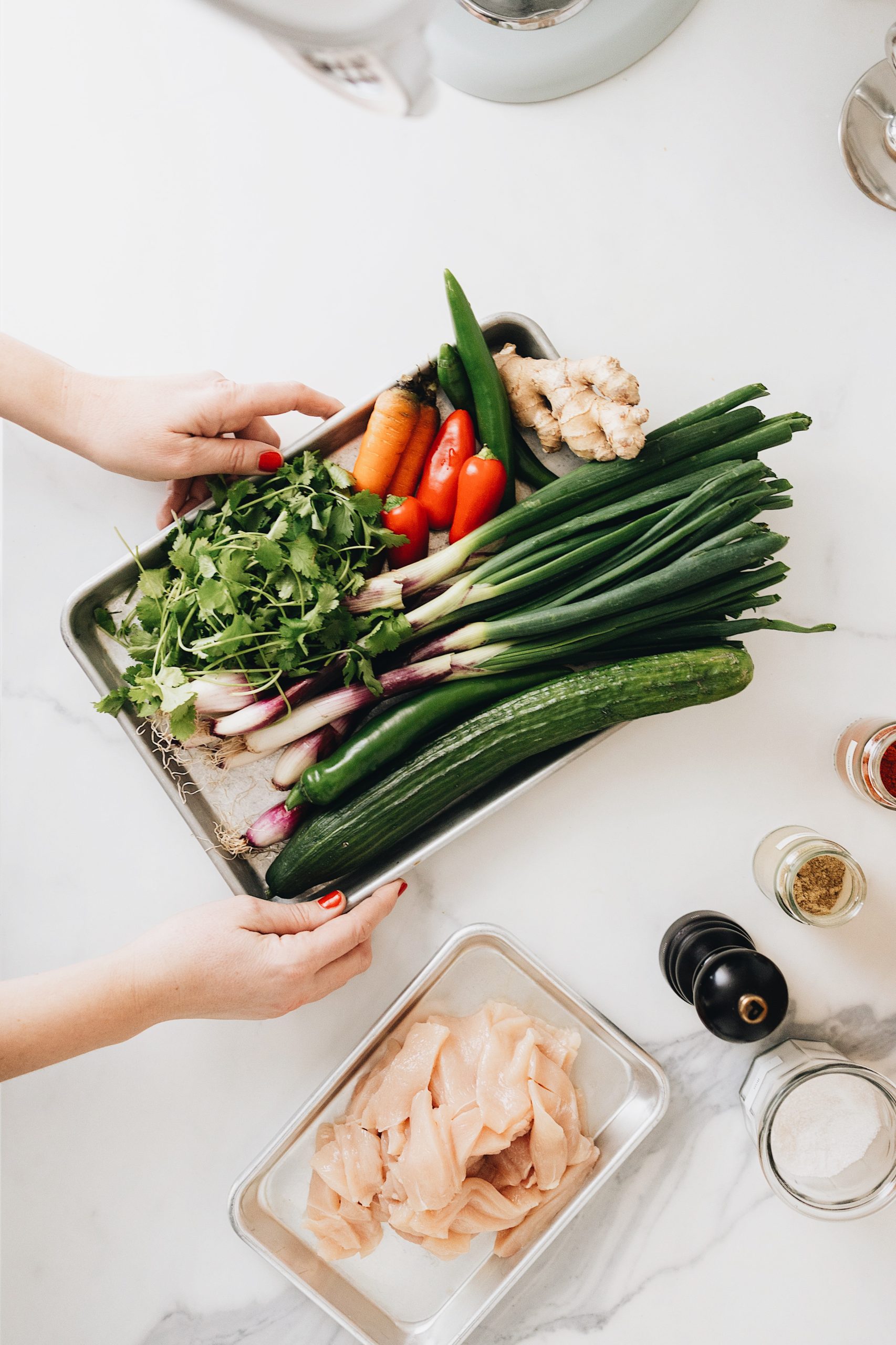 Il pollo e le carote potete tagliarli a pezzi. Il cipollotti ed il peperone dolce semplicemente in due, infine il ciuffo del cipollotto potete fare delle rondelle grossolane giusto per regolarvi con le dosi. Il coriandolo lo potete inserire così.