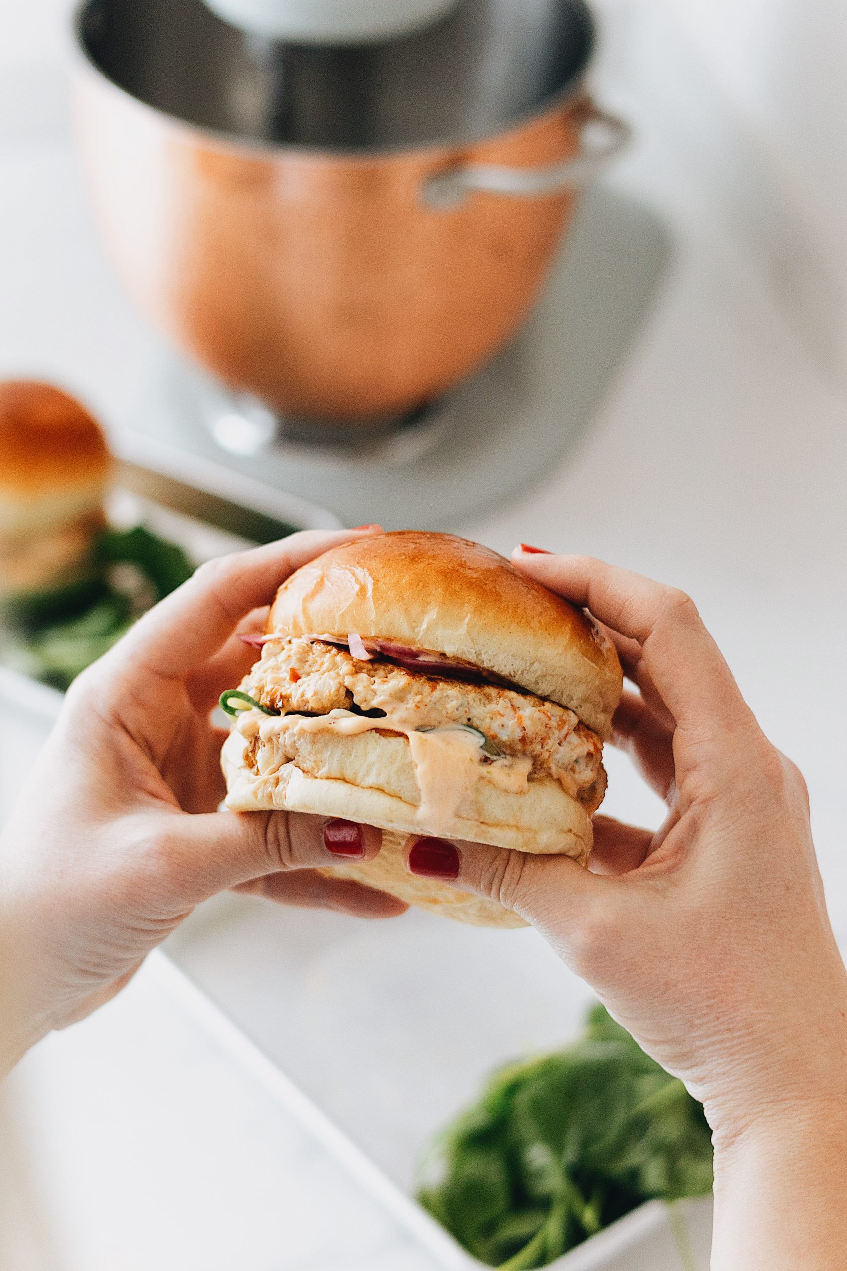 Salsa maio per 4 burger: 4 cucchiai di maionese, 2 cucchiaini di ketchup, 1 ½ cucchiaino di salsa Sriracha, scorza grattugiata di 1 lime. Miscelate bene.