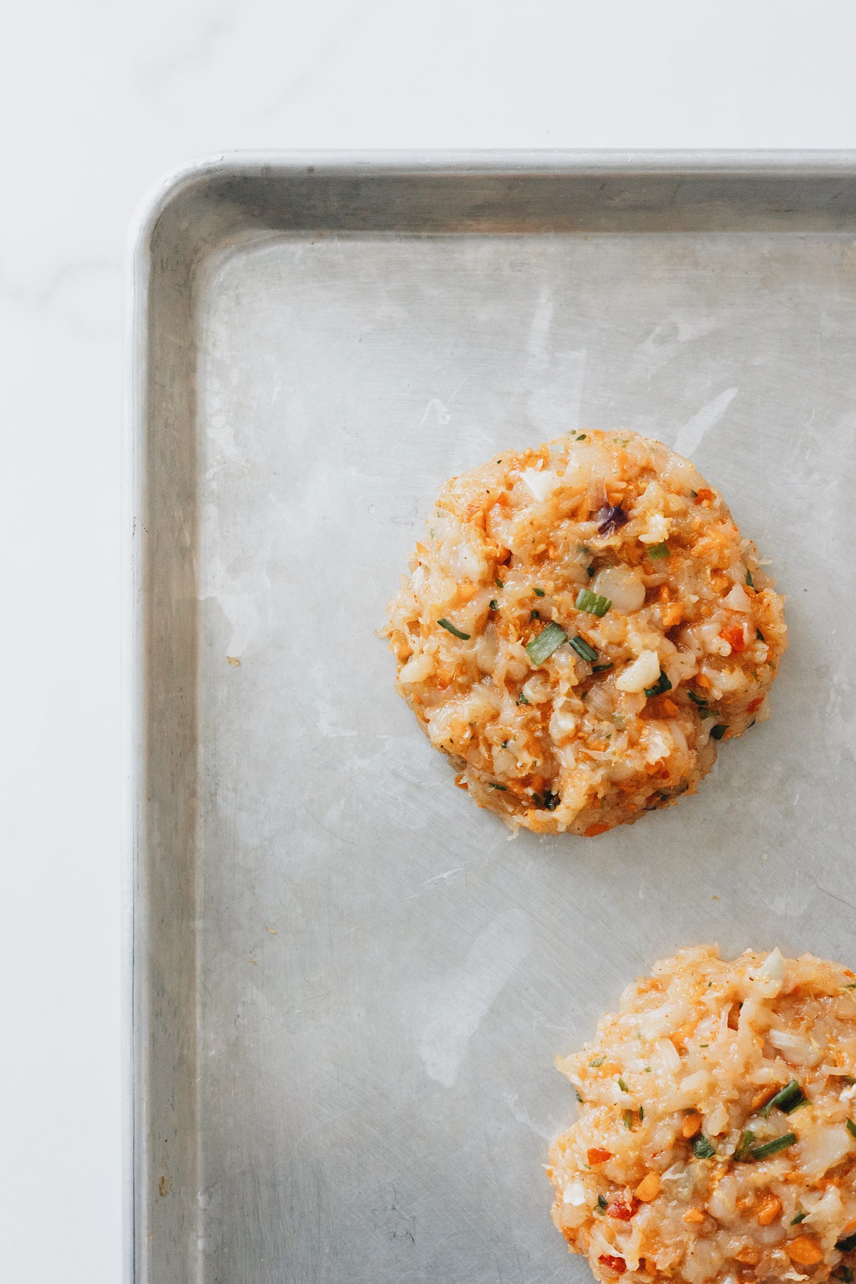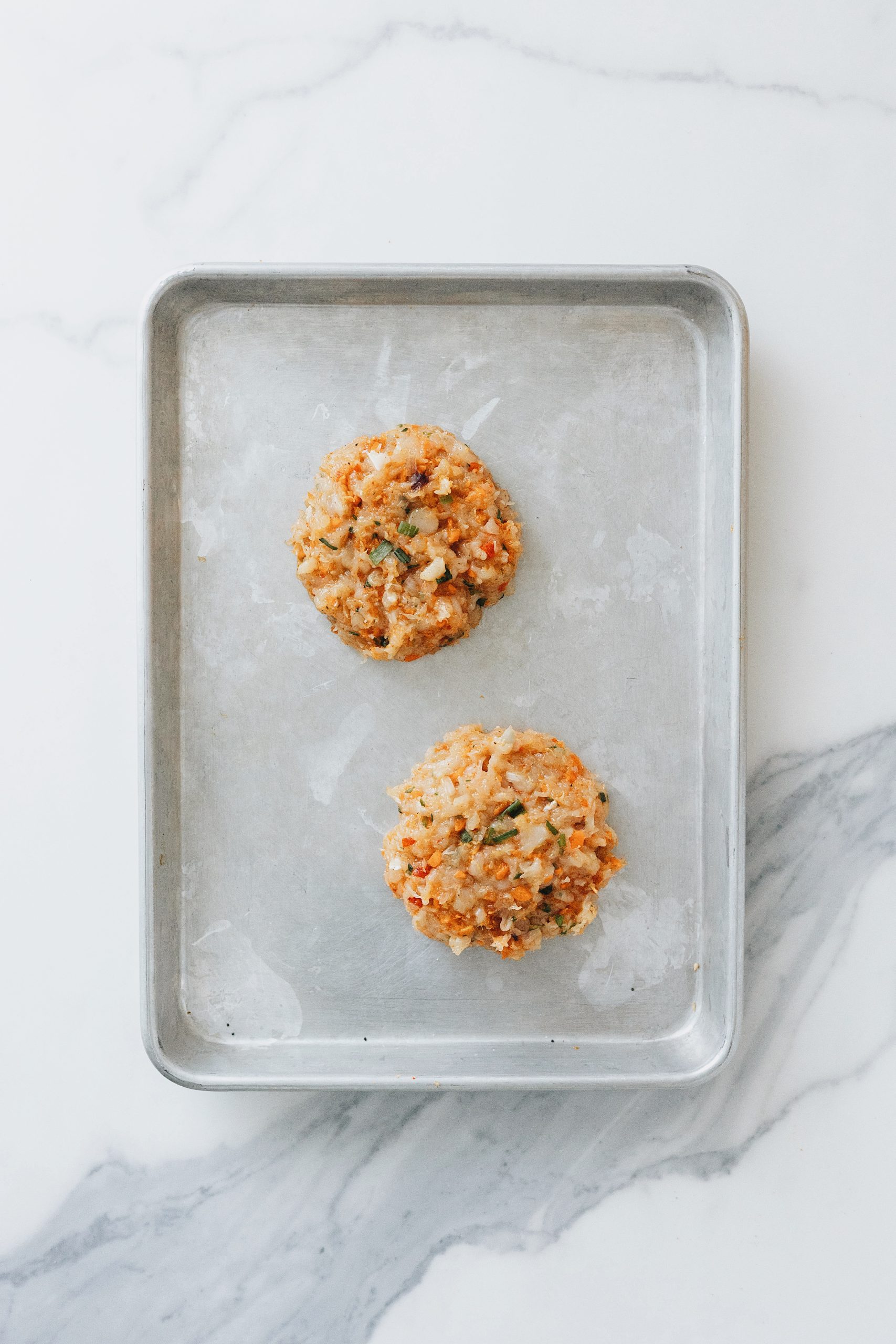 Il composto sarà un po’ appiccicoso, ma nessun problema. Formate dei dischi e posizionateli su un vassoio coperto con carta da forno.