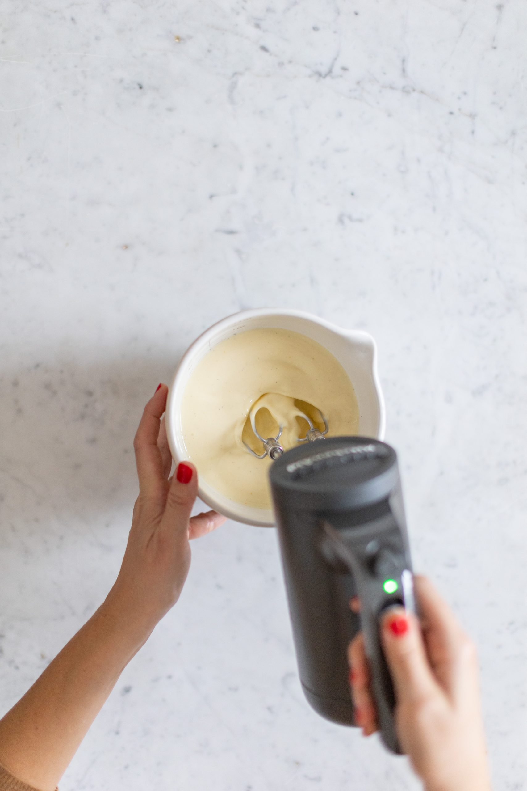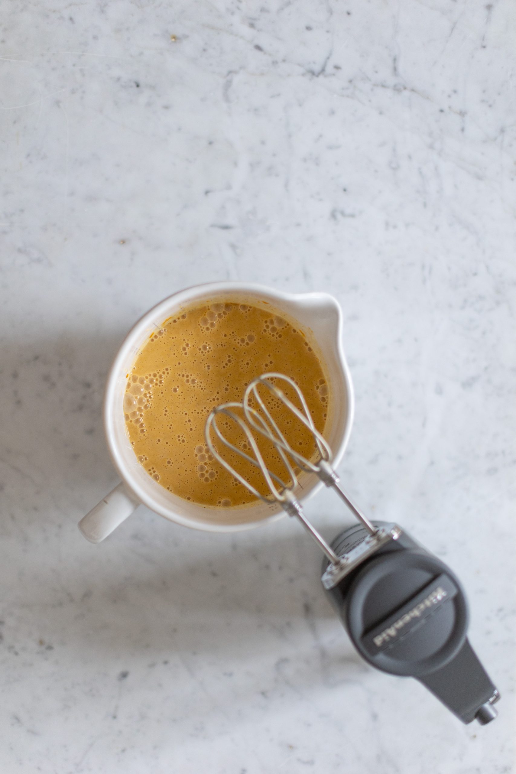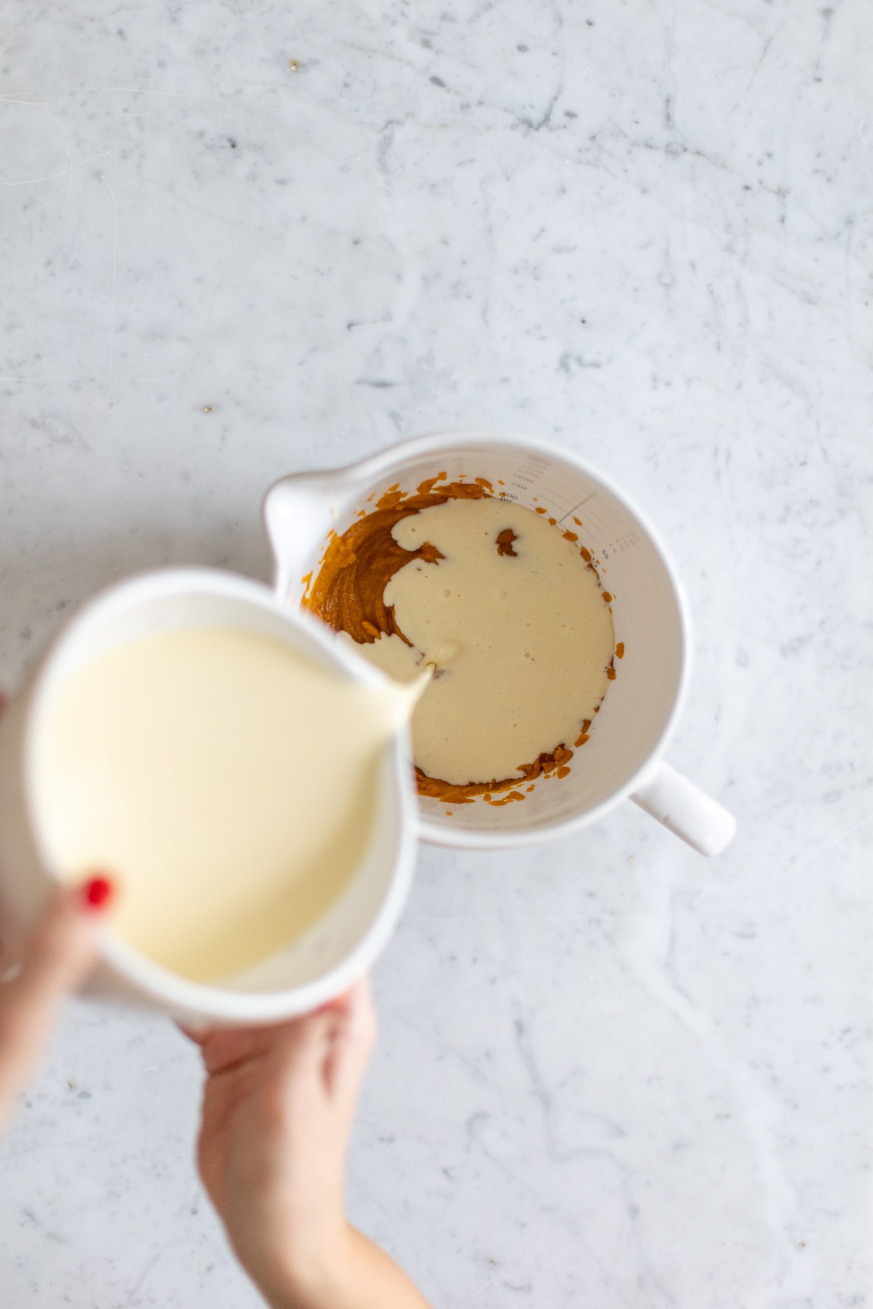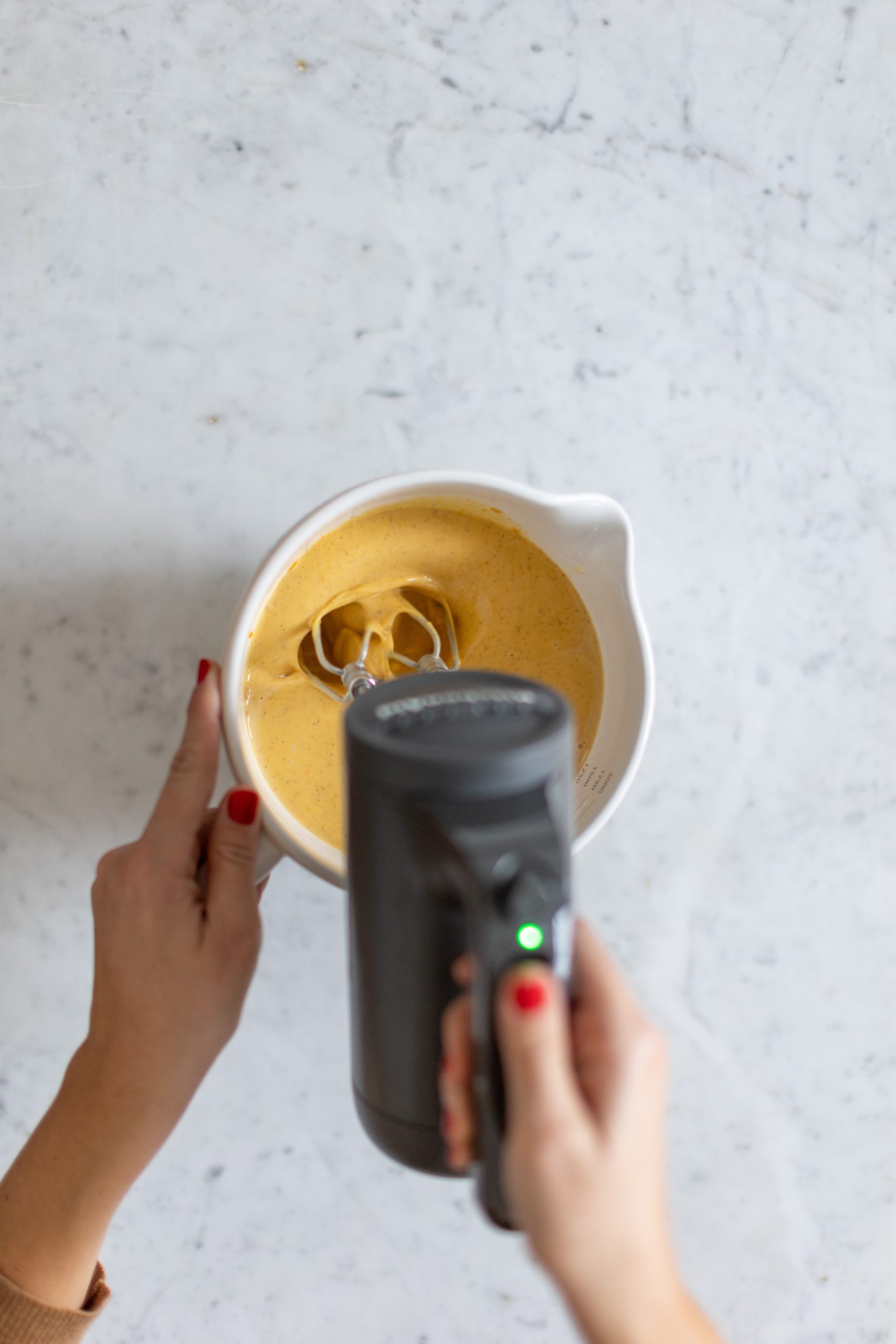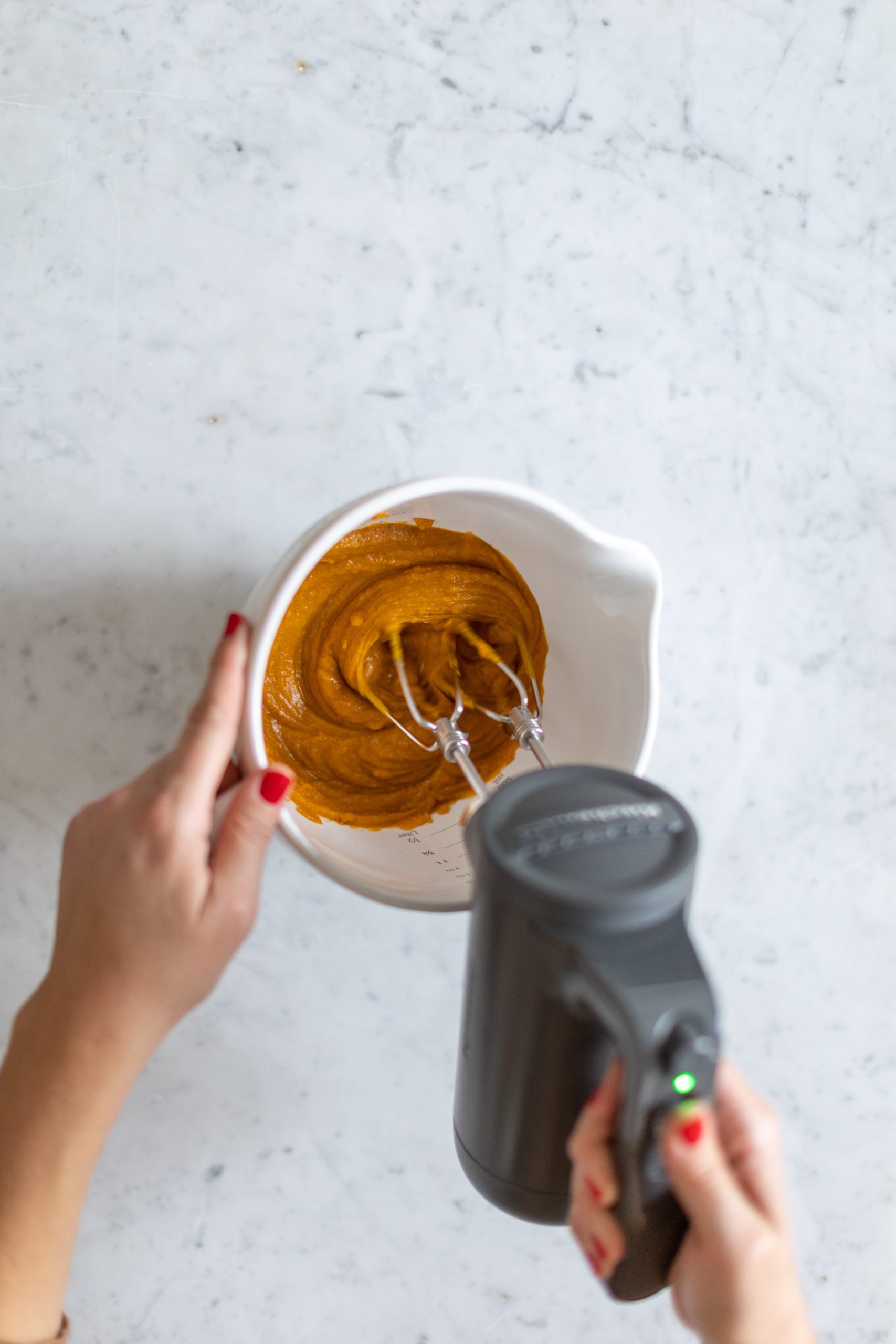 Prendete una ciotola e versatevi lo zucchero di canna, il mix di spezie in polvere e la purea di zucca (guardate le note) e con l’aiuto di uno sbattitore elettrico miscelate bene il composto. Io ho usato lo sbattitore elettrico senza fili di KitchenAid, assolutamente comodissimo. Non sempre si ha una presa elettrica vicino, o spesso quelle che ci sono sono sempre occupate, un grande classico, per questo la linea cordless è comoda, ti dà libertà.